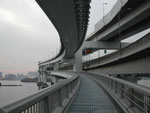 台場まで約1.7キロ。歩道の所々に車で言う待避所みたいなスペースがあって、そこで立ち止まると湾内を眺めるのにいい。しかし足下は鉄骨の構造物。その下は海面。高いところが苦手な人は下を見ないようにしよう。ここの高さは海面から50メートル。ひええ。
