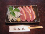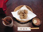 まずは多摩の地酒“多摩自慢〜700円”を飲みながら、“板わさ〜500円”をいただく。分厚く切られたかまぼこに山葵を乗せて一口。美味いので醤油がいらないのだ。それから蕎麦屋でしか味わえない“そばがき揚げ〜800円”をもらう。そばがき自体は茫漠とした滋味豊かなものだが、それをカラッと揚げたものだ。鰹節とネギの薬味に醤油をかけて、ともに頬張る。これは熱々のうちにどうぞ。下戸の方にもお勧めの一品だ。